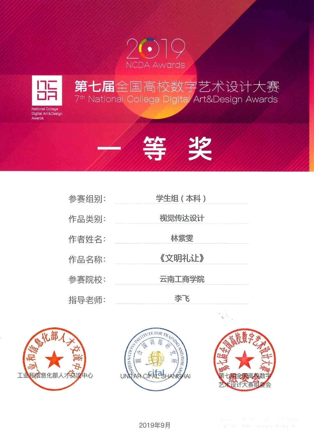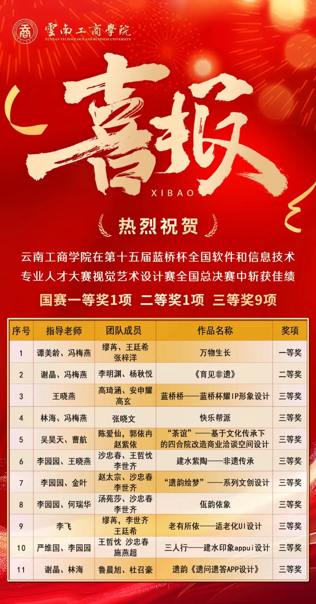 在国内外各专业赛事上获奖共计166项,其中专业带头人张卫伟获3项国际“红点奖”,视觉传达设计专业付曦同学设计作品荣获国际A' design全球银奖,王靖茜荣获全球铜奖,王金胜荣获全球铁奖。学院获批教育部产教融合项目7项;纵向科研11项;编写教材9本,专著3本;发表论文155篇,专利13项。“翠羽银丝”曾作为东航的国宾礼赠送。曾获“省级特色专业”“艺术设计创新人才培养模式区”“云南省综合改革试点专业”“云南省视觉传达设计支撑产业升级重点专业(群)”“省级校内示范实训基地”等6项云南省教育厅质量工程项目。教学环境达到省内先进水平。