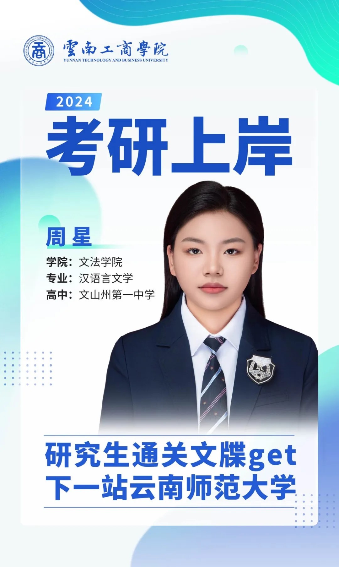 大家好,我是周星。高中毕业于文山州第一中学,今年考研顺利上岸云南师范大学,研究方向是中国哲学。大学期间获得过两次全国大学生电子商务“创新、创意及创业”挑战赛省级一等奖;中国国际大学生创新大赛(原全国“互联网+”创新创业大赛)铜奖;“云岭杯”中华经典诵写讲大赛省级二等奖、三等奖;云南省中国语言文学类专业本科大学生语文课程教学比赛省级一等奖等。