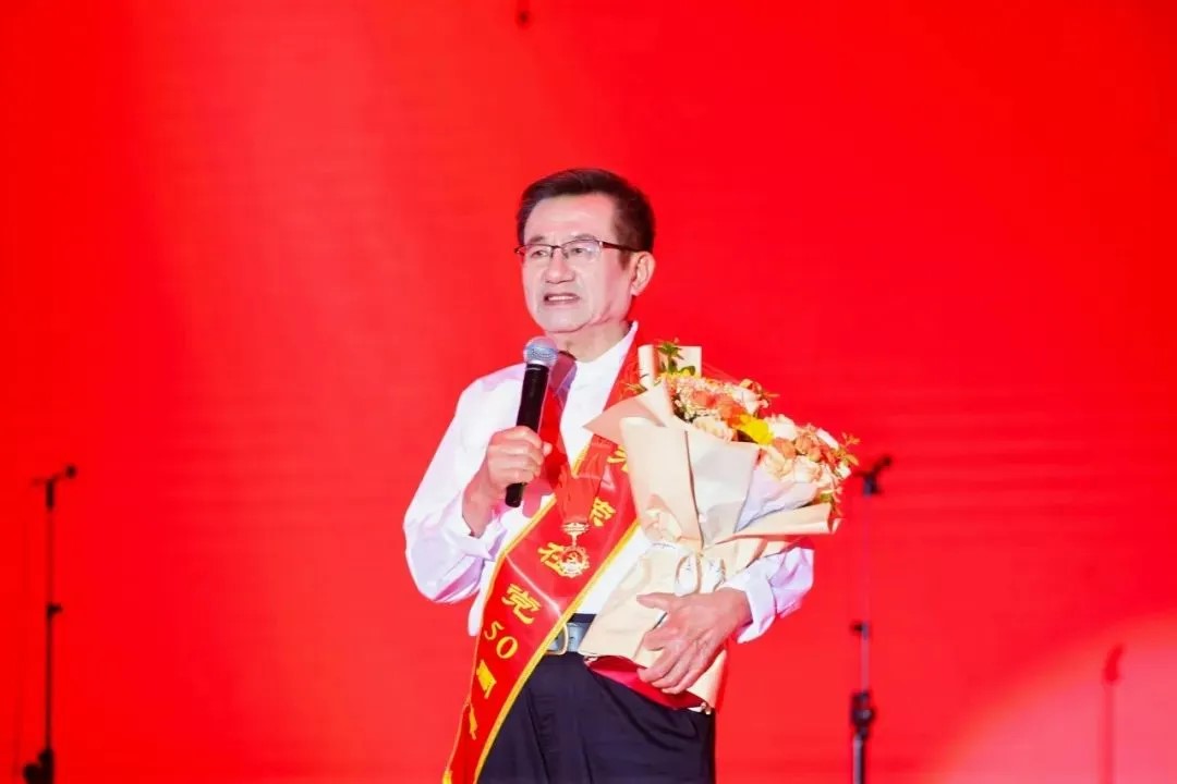 李国琼向老党员陶国胜教授颁发“光荣在党50年”纪念章。
