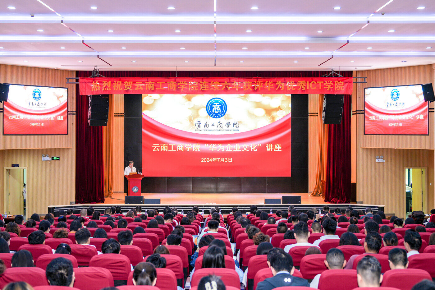 当天,华为公司副总裁、公共事业系统部总裁李俊风以《华为企业文化及核心价值观、创新战略交流》为主题,为300余名师生代表开展专题讲座,他结合华为公司企业文化与核心价值观讲述华为科技创新的高质量发展之路,讲座立意深远、内涵丰富,强有力地激发了与会师生的奋斗精神。讲座后,师生踊跃提问,现场互动交流,氛围热烈。大家纷纷表示,今后将所学所感所得融入今后的学习工作中去,践行学校“最以学生为中心”理念,在团结奋斗中不断开创学校高质量发展新局面。