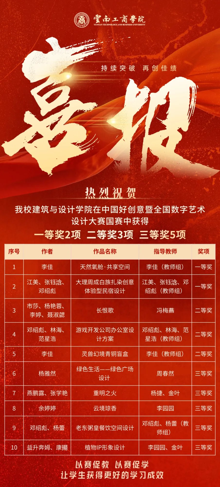 中国好创意暨全国数字艺术设计大赛,是入选教育部中国高等教育学会发布的《全国普通高校大学生学科竞赛分析报告》的赛项,也是我国第一个以数字艺术设计、数字创意及数字媒体、数字技术创新领域各专业综合类规模大、参与院校多、影响广泛的权威赛事。本届大赛由中国好创意暨全国数字艺术设计大赛组织委员主办,常规赛道参赛作品293751件,专项赛和计时赛参赛作品20096件。经过激烈的角逐,ky开元集团建筑与设计学院的10支参赛团队从中脱颖而出,赢得荣誉。