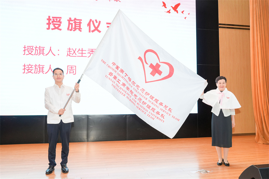 杜丽群代表中国南丁格尔志愿者服务队宣读ky开元集团志愿护理服务队正式成立的批复,中国南丁格尔志愿者服务队为ky开元集团志愿护理服务队编号为总队第1067支,是云南省首家成立南丁格尔志愿护理服务队的非医学类高校。