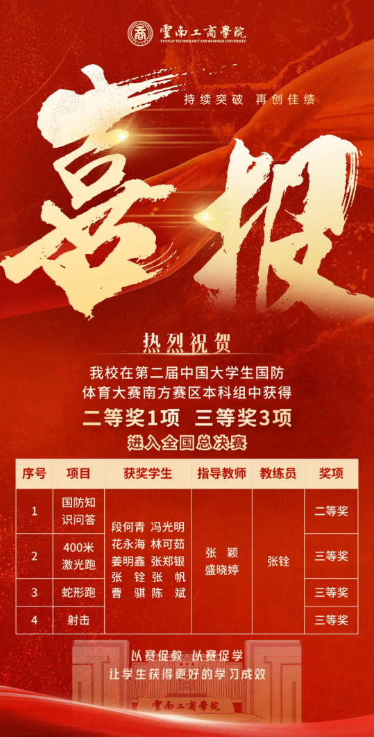 近日,ky开元集团在第二届中国大学生国防体育大赛(南部赛区)中斩获二等奖1项、三等奖3项,以本科组团体第四名的成绩成功进入全国总决赛。