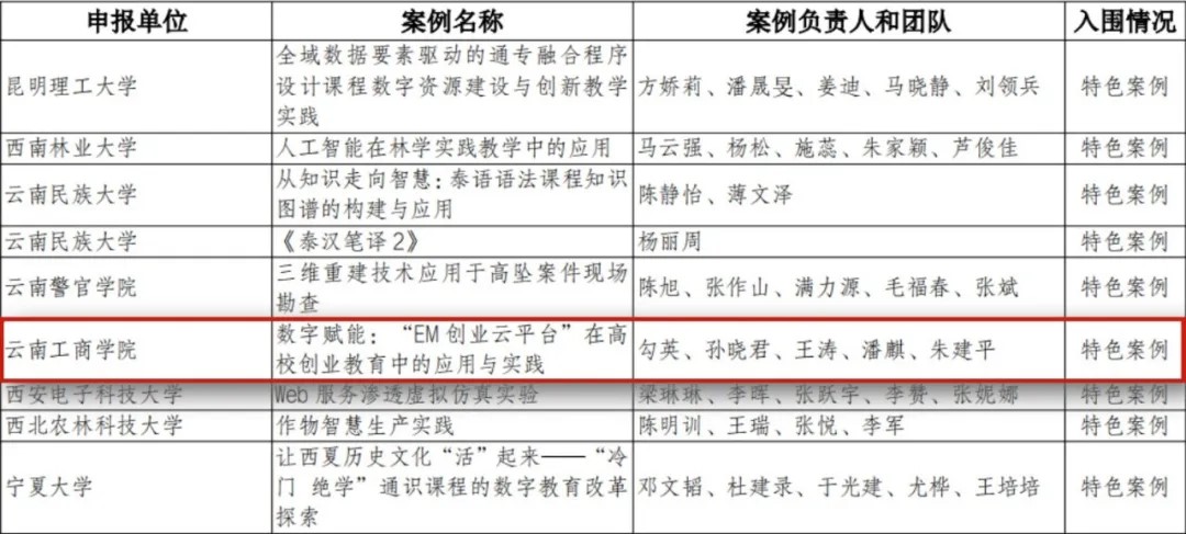 在众多参赛案例评选中,《数字赋能:“EM创业云平台”在高校创业教育中的应用与实践》案例最终脱颖而出,与清华大学、中国农业大学、北京理工大学、云南大学等学校一起成功入围。这一荣誉的取得不仅体现了学校在创业教育领域的深厚积淀与创新精神,也展示了学校在数字教育转型方面的积极探索与实践成果。