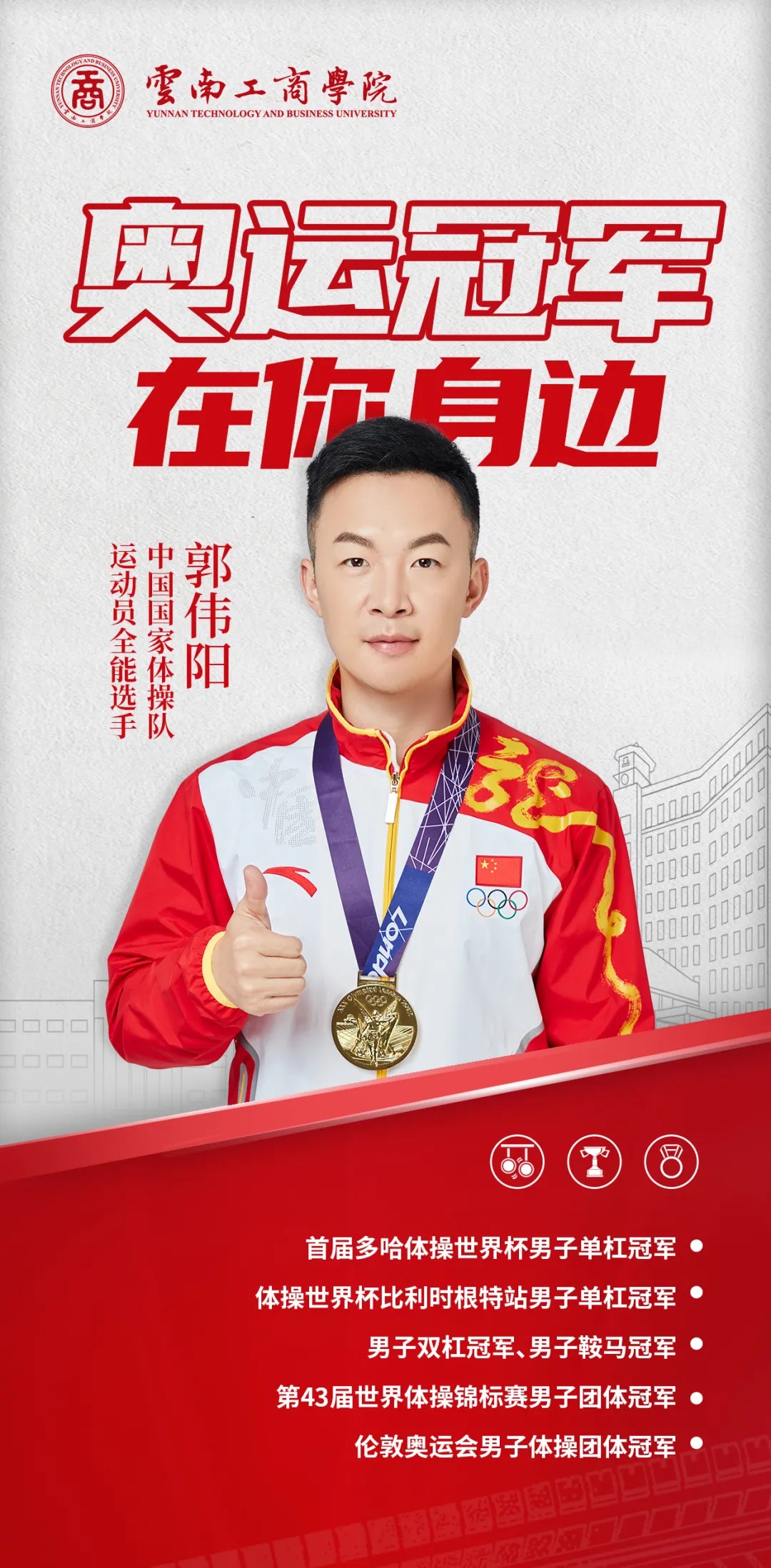 郭伟阳,云南玉溪人,中国国家体操队运动员全能选手,伦敦奥运会男子体操团体冠军,国家体育荣誉奖章、云南省五一劳动奖章获得者。作为奥运冠军,同时也是一名老党员,郭伟阳在退役后继续奉献,通过公益活动,传递体育精神,引领广大青年坚定不移地跟党走。