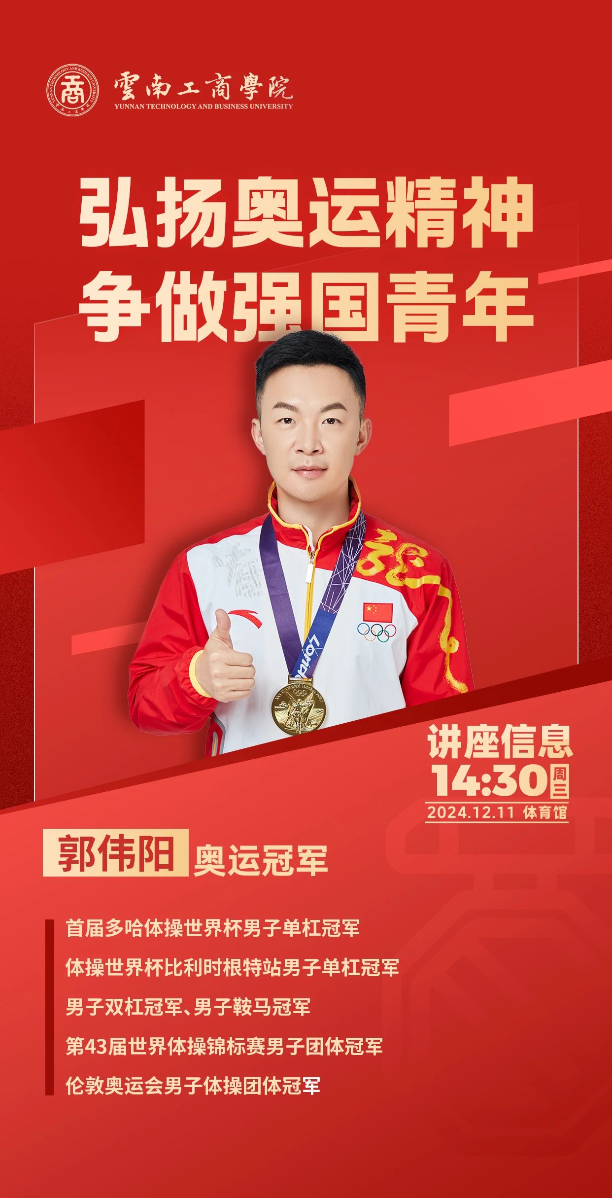 讲座现场,郭伟阳将通过回顾自己的运动生涯,分享从一名普通运动员成长为奥运冠军的心路历程;通过讲述自己在训练、比赛过程中遇到的艰难与挫折,勉励同学们用奋斗书写担当,以拼搏进取的精神风貌,以砥砺奋发的昂扬姿态,展现青春作为、彰显青春风采、贡献青春力量。