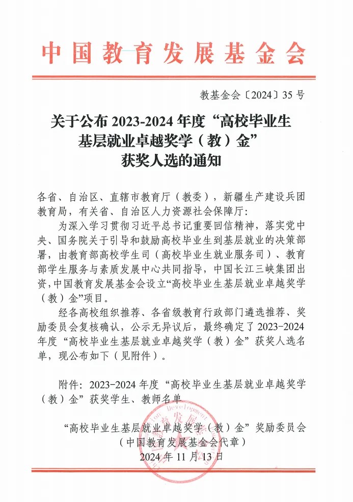 “高校毕业生基层就业卓越奖学(教)金”由中国教育发展基金会设立,教育部高校学生司(高校毕业生就业服务司)、教育部学生服务与素质发展中心共同指导,中国长江三峡集团有限公司出资,奖励对象为赴基层就业并做出突出业绩的普通高校毕业生和普通高校指导服务大学生赴基层就业工作有突出贡献的教师,旨在引导和鼓励高校毕业生到基层就业,扎根基层,担当时代责任。经各省(区、市)推荐,本次教育部共评选出398名毕业生、60名教师。