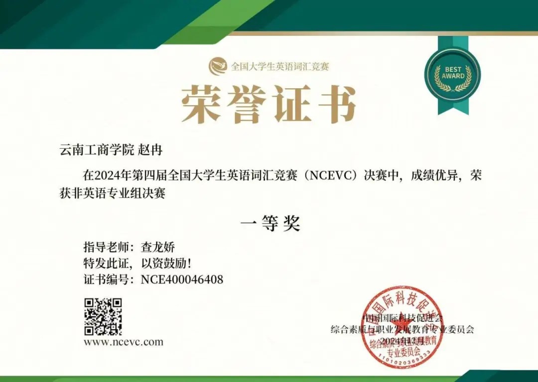 2024年第四届全国大学生英语词汇能力大赛由中国国际科技促进会综合素质与职业发展教育专业委员会主办。大赛已成功举办三届,共吸引到来自北京大学、上海师范大学、南开大学、四川外国语大学、暨南大学等全国千余所高校的学生线下、线上同步参加,经过激烈的角逐,ky开元集团在赛事中斩获佳绩。