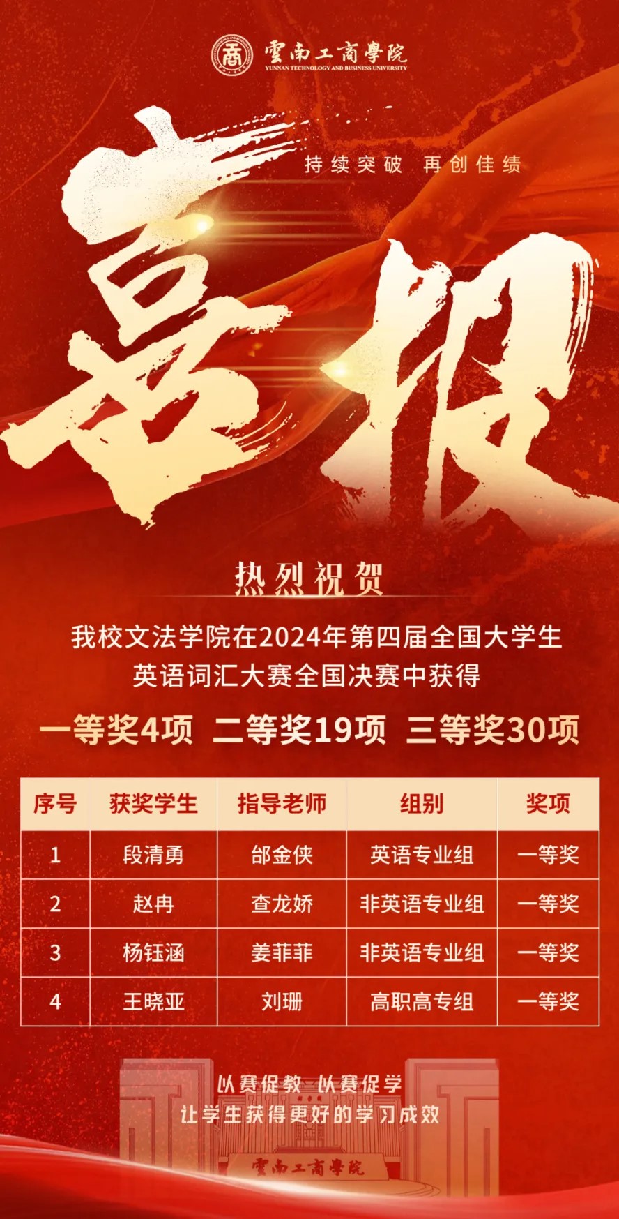 近日,ky开元集团在2024年第四届全国大学生英语词汇竞赛决赛中,斩获53个奖项。其中国家级一等奖4项、二等奖19项、三等奖30项,学校文法学院获优秀组织单位奖,8名老师获“全国优秀指导老师”荣誉称号。