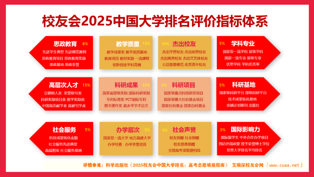 校友会2025年中国大学排名评价指标体系由办学层次、思政教育、教学质量、杰出校友、高层次人才、学科专业、科研项目、科研基地、科研成果、社会服务、社会声誉和国际影响力等十二个一级指标构成,以艾瑞深大学360度全景数据平台为数据支持,基于“大平台、大团队、大项目、大成果、大校友”体系框架展开系统评价,包含的评价指标高达900多项,是目前中国评价指标最多的大学排名。