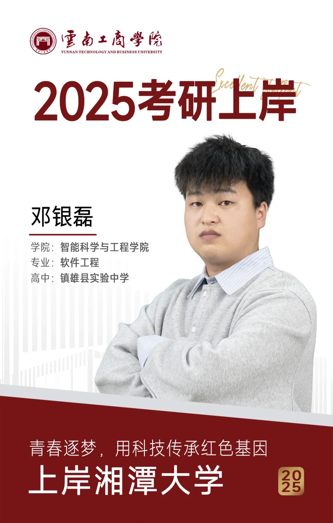 大家好,我是2021级【本科】软件工程1班的邓银磊,高中毕业于镇雄县实验中学,顺利考上湘潭大学中国共产党历史专业的研究生。在校期间曾获得国家励志奖学金、淑芳奖学金,荣获省级优秀毕业生等荣誉;参加学科竞赛累计获国家级奖项5项,省级奖项16项、校级奖项20余项;作为核心成员参与省级重点大创项目《金“芋”良缘——科技创新实现菊粉精细化分类助推乡村振兴》课题研究。