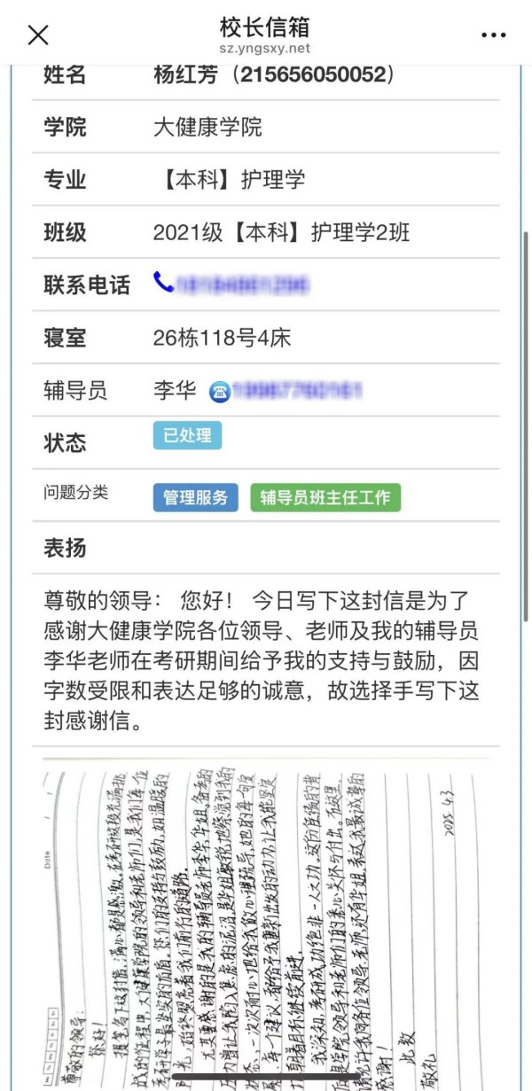 杨红芳说:“李华老师的每一句安慰、每一个建议,都像是黑暗中的光亮,给予我向阳出发的动力,让我能坚定地朝着目标前进。”《校长信箱》留言限200字,但她想说的话太多太多,于是,她选择用传统的书信方式,在字里行间真挚表达对自己关爱及指导的感谢。今年9月,杨红芳也将以一名研究生的身份,踏上新的征程。