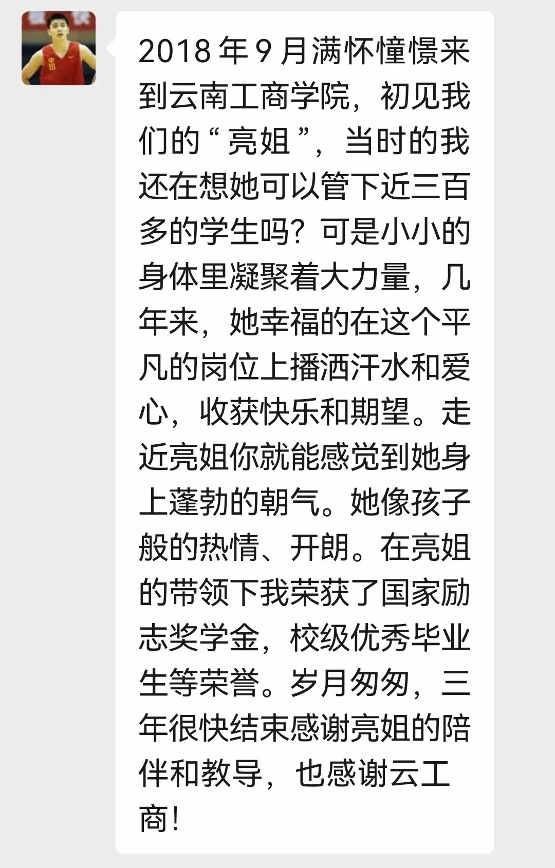 从“事务管家”到“精神守望者”,从“危机消防员”到“成长设计师”,李明亮的角色不断进化,但初心始终如灯塔般清晰。她深信育人既是“静待花开”的陪伴,更是“修枝扶正”的引领;既要成为情绪低潮时的缓冲垫,也需化作突破舒适区的推进器。当毕业十年的学子仍向她分享人生新篇,当深夜的微信窗口跳出“亮姐,我做到了”的讯息,这份跨越时空的羁绊,正是一名教育者最珍贵的生命回响。她用岁月沉淀出对辅导员角色的深刻诠释,以心为舟,以爱为桨,摆渡着一代代青春的航船驶向辽阔人生。