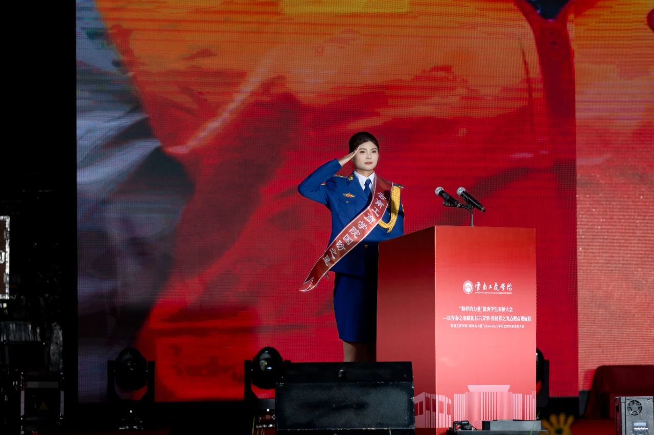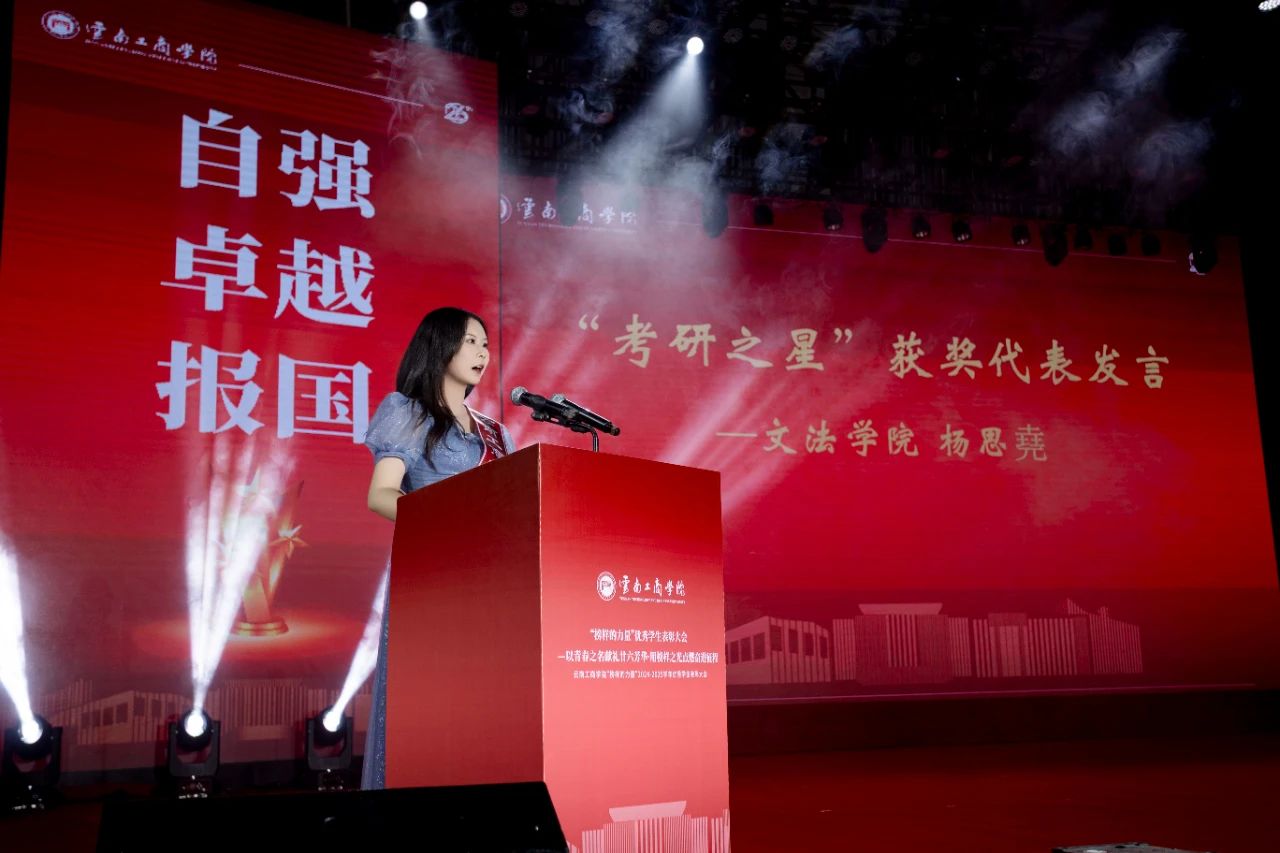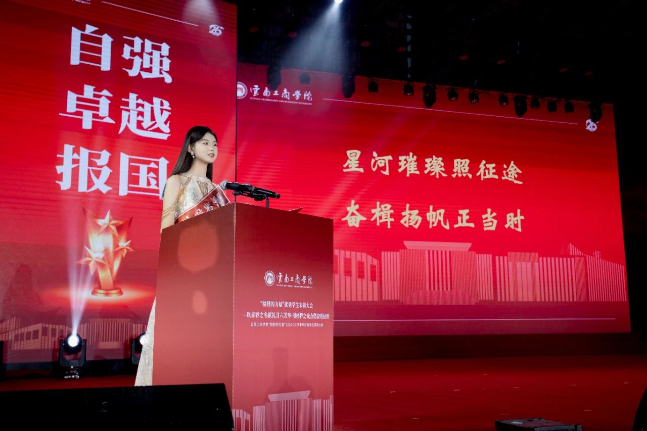 国家奖学金获得者普欣悦同学作为获奖代表,分享了自己在学业上勤奋努力、实践中的锻炼成长以及创新思考探索的体验,她表示,“自强、卓越、报国,不仅是镌刻在墙上的校训,更应成为学子知行合一的奋斗航标。希望同学们以青春为笔,以奋斗为墨,努力书写属于云工商学子的星辰大海。”她的发言,激励着同学们在自强的道路上勇往直前。