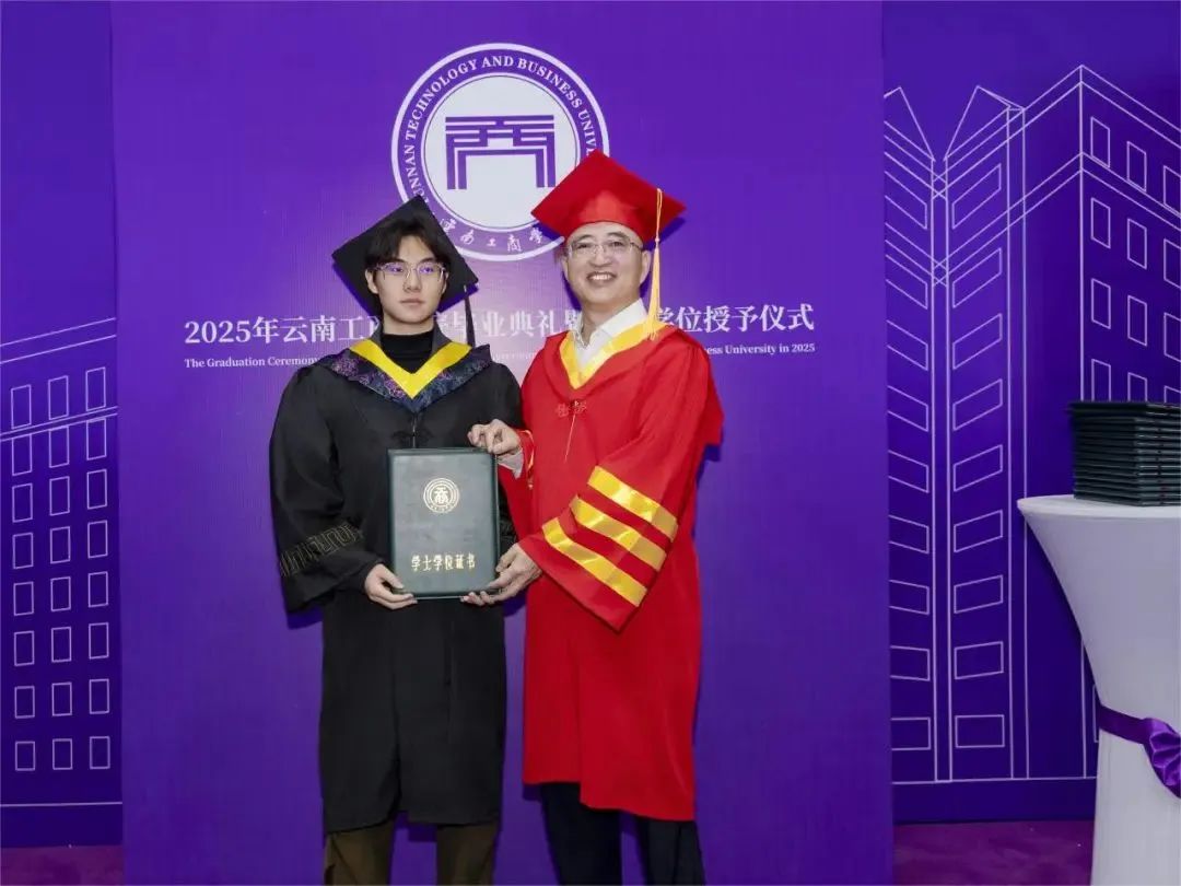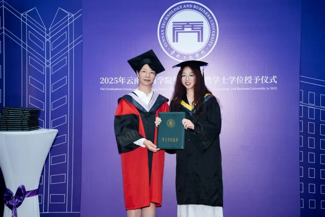 《关于准予2025届普通全日制本科生、专科生毕业的决定》《关于授予2025届本科毕业生学士学位的决定》宣读完毕,毕业生依次上台,学校领导为专科毕业生授予毕业证书。学校导师团为本科毕业生正冠拨穗,授予学位证及毕业证。