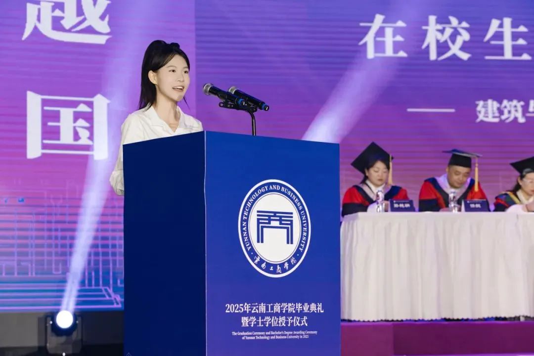 在校生代表张亚媛同学代表全体在校生,向圆满完成学业的学长学姐们致以祝贺。感谢他们作为榜样,在学业钻研、科技创新、社会实践、志愿服务、校园文化建设等各方面展现出的卓越风采和不懈追求,为学弟学妹们树立了标杆,为学校留下了宝贵的精神财富。承诺将接过接力棒,努力在求知的道路上走得更稳、更远,不负学校的厚望,不负学长学姐的期许!