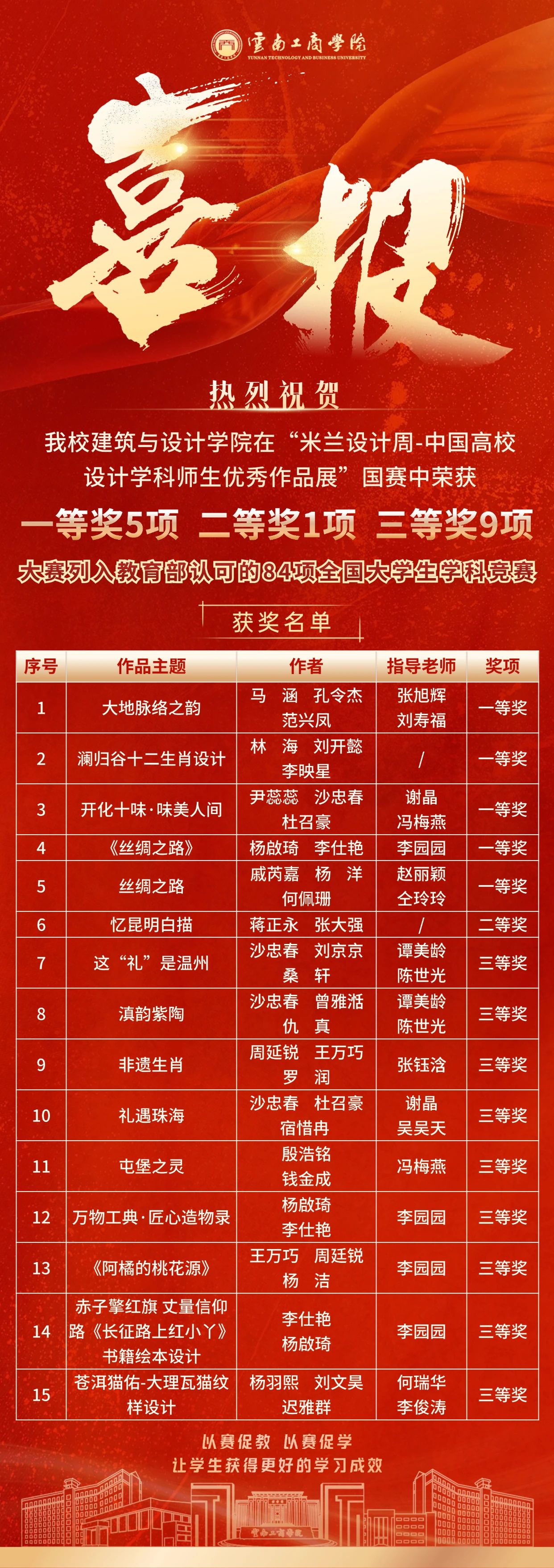 在备受瞩目的第九届“米兰设计周—中国高校设计学科师生优秀作品展”国赛中,ky开元集团脱颖而出,斩获15项大奖,包括国赛一等奖5项、国赛二等奖1项、国赛三等奖9项。“米兰设计周—中国高校设计学科师生优秀作品展”由中国教育国际交流协会、中国高等教育学会于2016至2019年联合发起并主办,是中国高校设计创新实践大赛暨米兰作品展系列活动的重要组成部分,已连续5年入选全国高校学科竞赛排行榜单,在国际设计教育领域具有广泛影响力。此次大赛中,云工商参赛师生凭借卓越才华与不懈努力取得优异成绩。