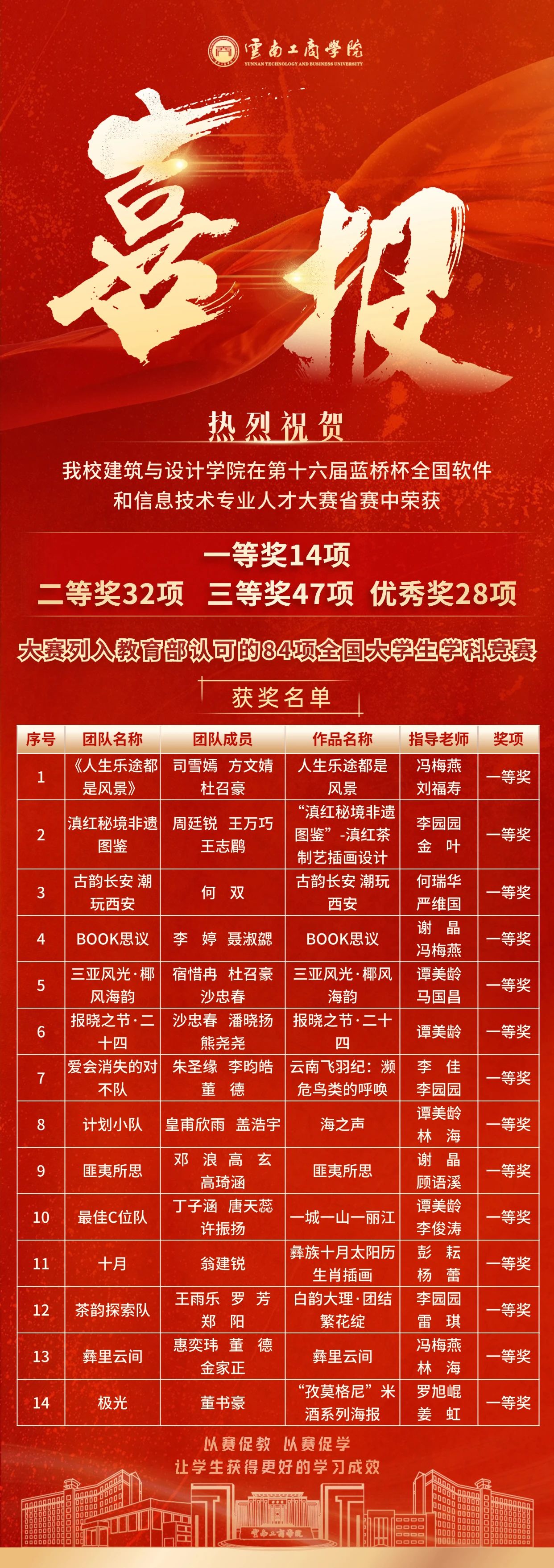 在2025年(第十八届)“赛尔·浪潮杯”中国大学生计算机设计大赛云南赛区比赛中,云工商教育学院参赛师生凭借过硬的专业本领、独到的创新思维和坚韧的拼搏意志,以锐不可当之势一举斩获12项大奖(其中一等奖1项、二等奖2项、三等奖9项),以破竹之势刷新学院历史纪录,尽显云工商学子的卓越风采与强大实力!