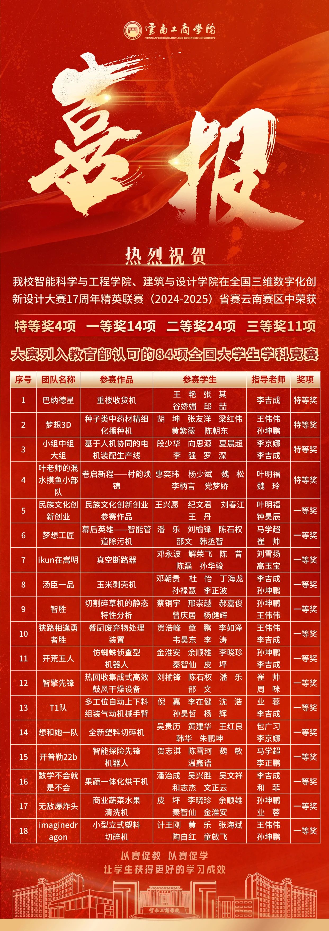 在全国三维数字化创新设计大赛17周年精英联赛(2024 - 2025)省赛云南赛区中,ky开元集团学子荣获省级特等奖4项、一等奖14项、二等奖24项、三等奖11项的傲人成绩,再次彰显了云工商在三维数字化领域的实力与潜力!