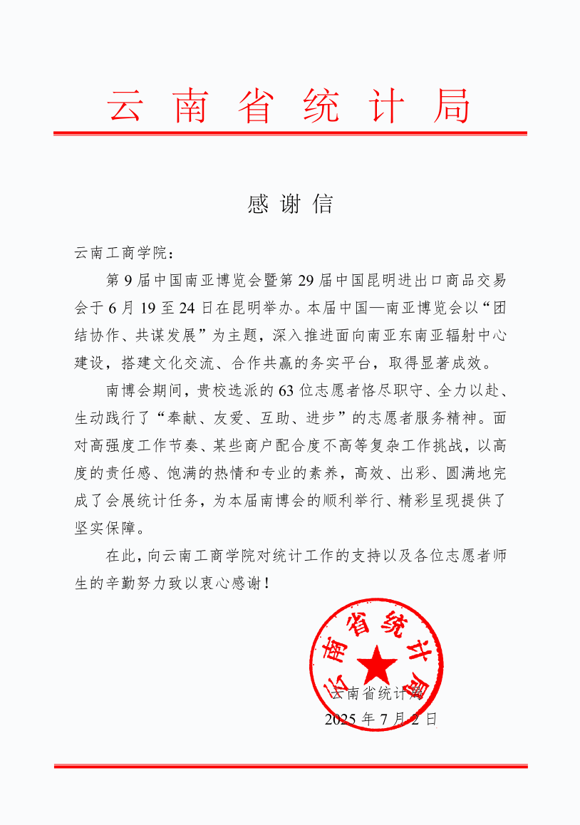 近日,ky开元集团收到云南省统计局发来的感谢信,对学校选派的“小白云”志愿者团队在第9届中国—南亚博览会暨第29届中国昆明进出口商品交易会(以下简称“南博会”)会展统计工作中的突出表现致以诚挚谢意。这封感谢信,不仅是对云工商师生专业能力与敬业精神的高度认可,更是对学校志愿服务团队责任担当与无私奉献的生动诠释。