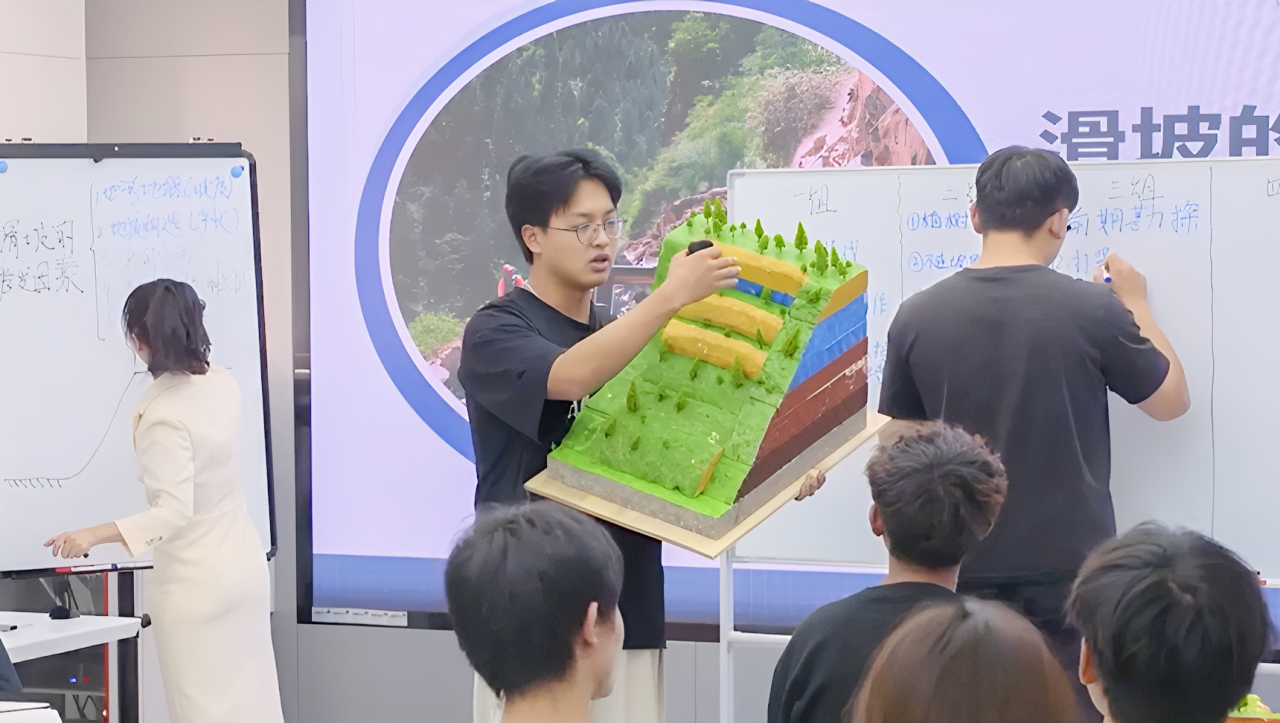 3D裸眼技术让花岗岩微观结构纤毫毕现;8大虚拟仿真库精准还原地质灾害;学生运用奥维地图为8个老旧小区开展“地质体检”,提出的27条加固方案被社区采纳;实习工坊对接省设计院等真实项目,学生独立完成从岩芯编录到“一页纸风险预警”的全流程。