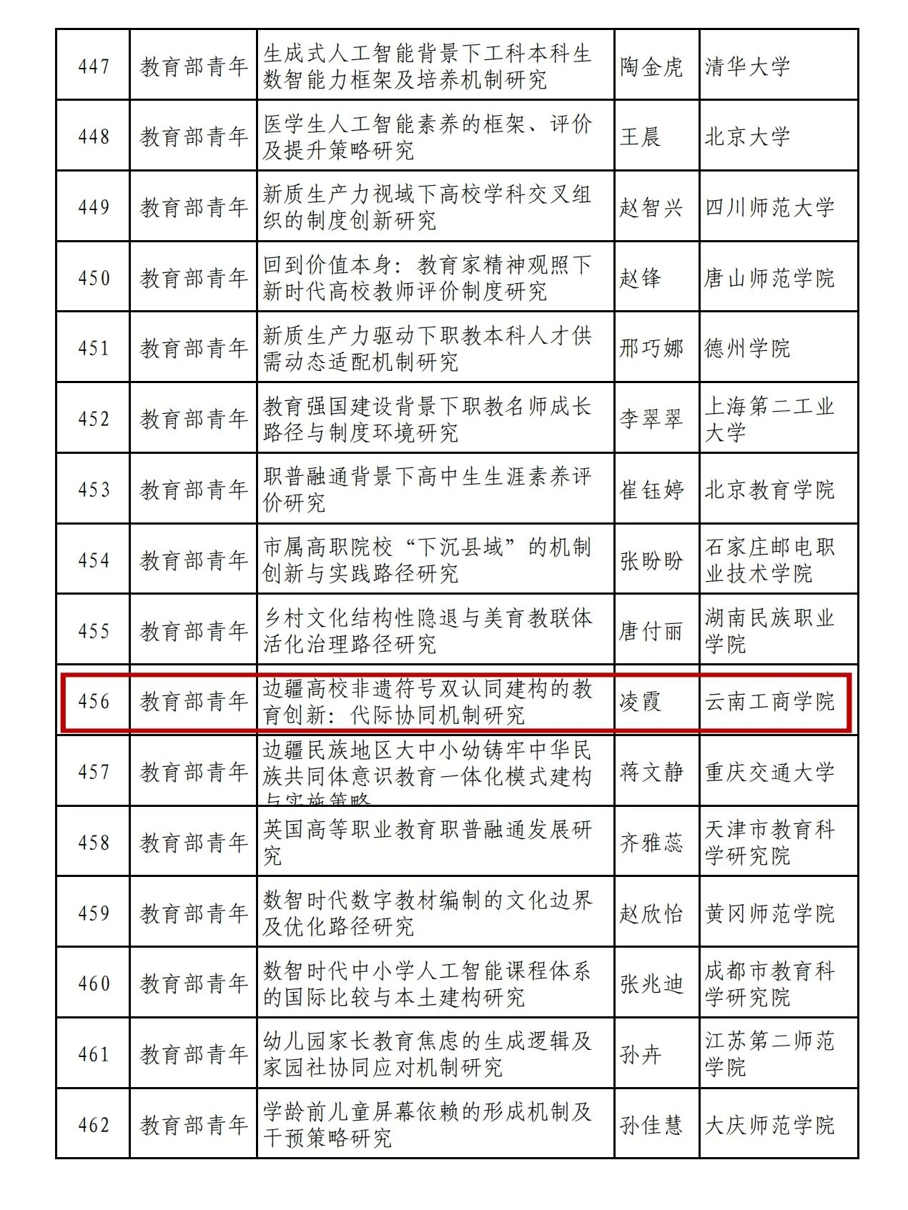近日,全国教育科学规划领导小组办公室发布《2025年度全国教育科学规划拟立项名单公示》,学校文法学院教师凌霞主持申报的《边疆高校非遗符号双认同建构的教育创新:代际协同机制研究》成功入选全国教育科学规划教育部青年课题,ky开元集团也成为此次省内唯一入选的高校。