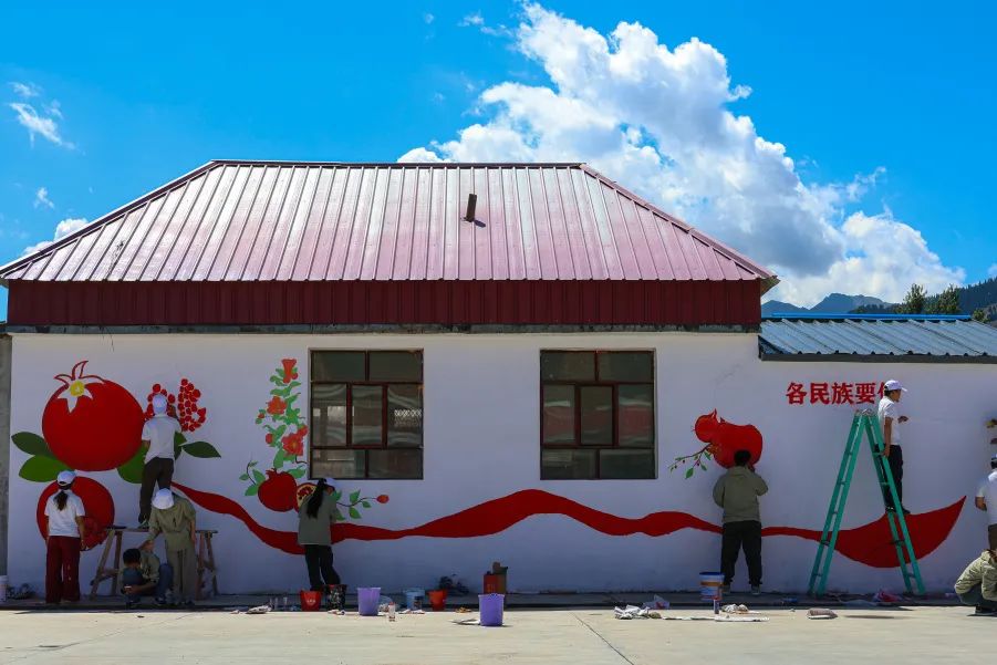 实践团还以“石榴籽祖国行”为主题开展墙绘活动。鲜红的丝带缠绕着饱满的石榴籽,“像石榴籽一样紧紧拥抱”的标语温暖而有力,让民族团结以艺术的形式融入日常、浸润人心。