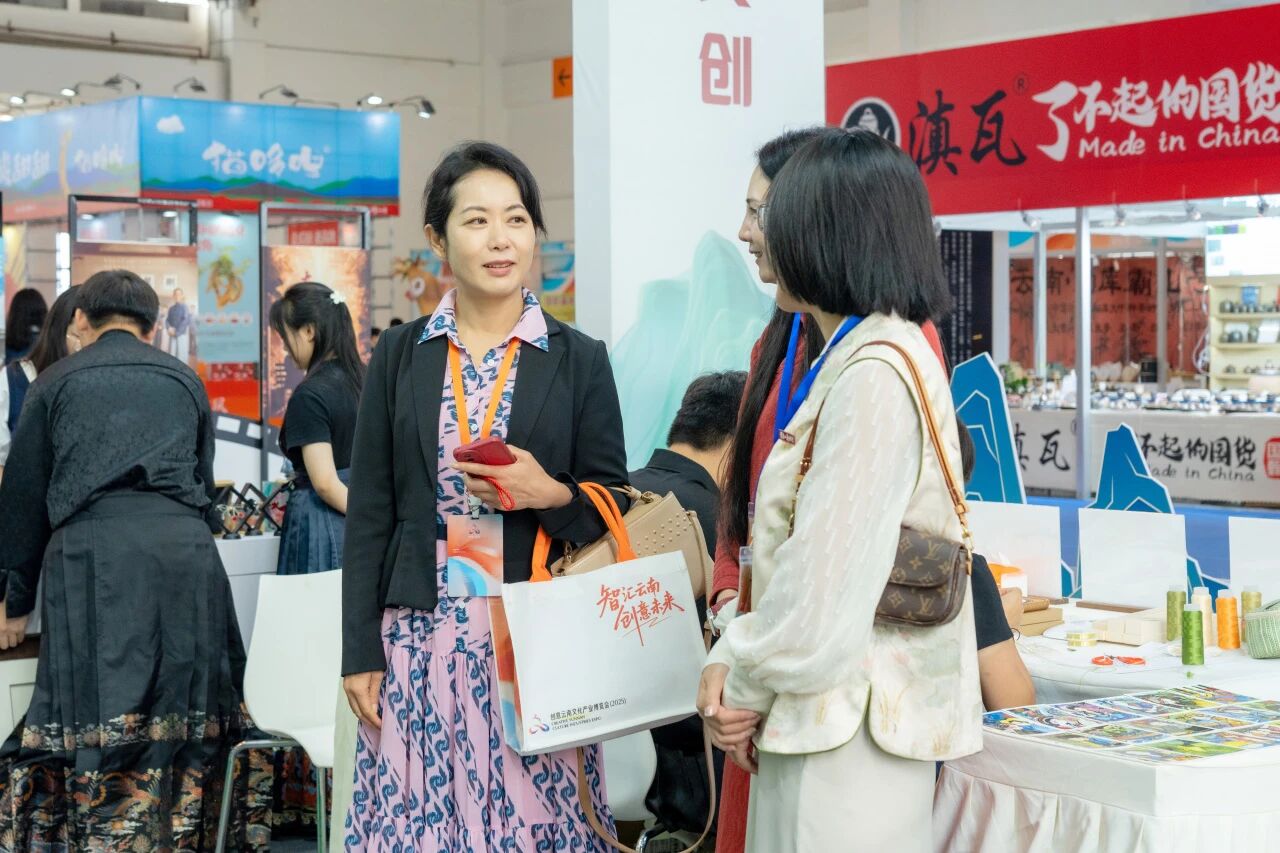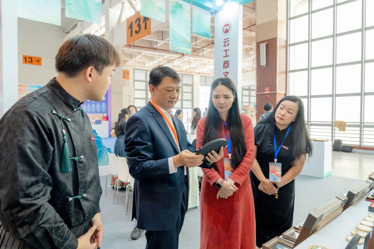 展会期间,北京大学文创团队来到云工商展位,与学校师生就文创产品的设计理念与运营模式进行深入交流。北大带队教师称赞云工商文创作品“将云南民族文化与现代设计巧妙结合”,认为这种创新实践为传统文化注入了新的活力。学校“翠羽银丝”工作室学生杜召豪分享了他的参展体验:“能以参展商的身份站在文博会的舞台上,我感到特别自豪!通过这次参展,我真正体会到了‘做中学’的魅力,也更加理解学校‘产教融合’人才培养模式的良苦用心。”