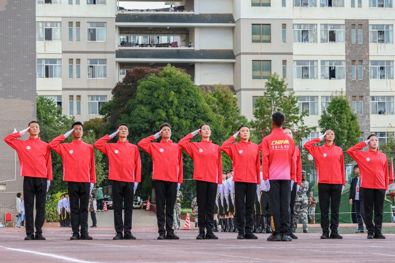 赛场上,ky开元集团国旗护卫队队员身着制式服装,身姿挺拔、神情庄重,以精准的动作和高度的默契完成了各项展示,充分展现了学校在国防教育方面的扎实工作与育人成效。
