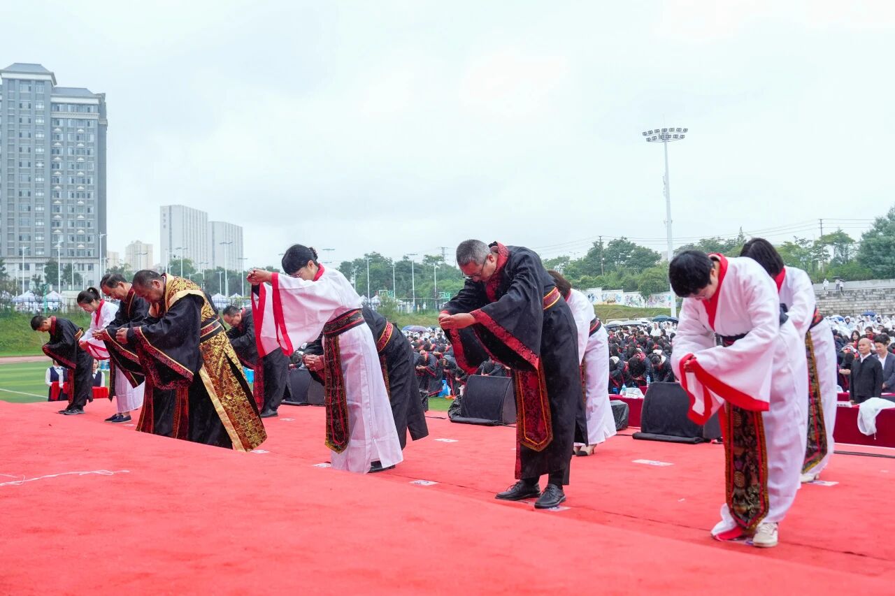 入学尊师礼在融合传统文化与现代教育的仪式中正式举行,学子们正衣冠,向孔子像敬献花篮,一拜自强不息,二拜厚德载物,三拜精忠报国,四拜孝亲尊师,五拜至亲父母。