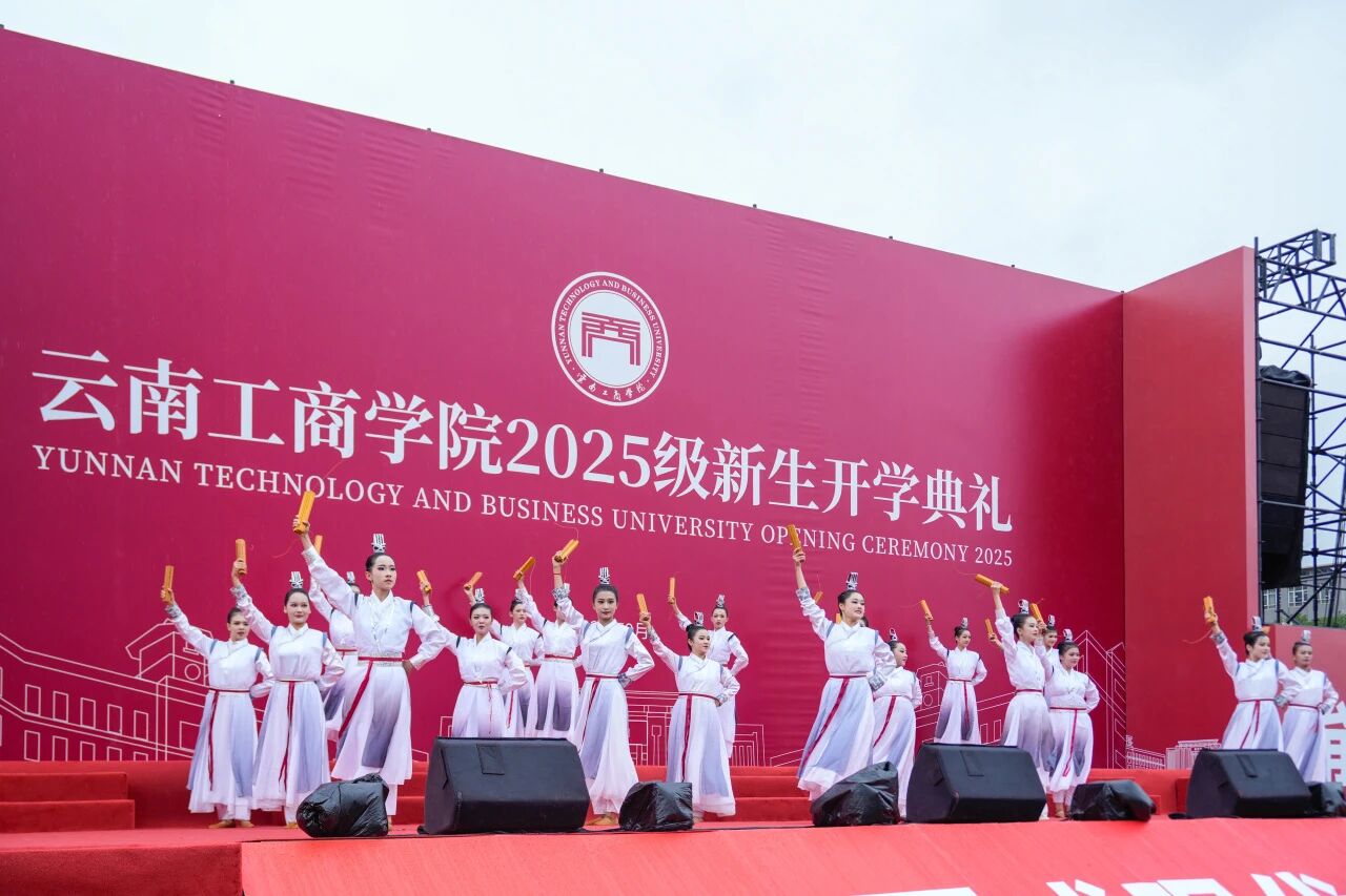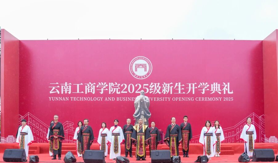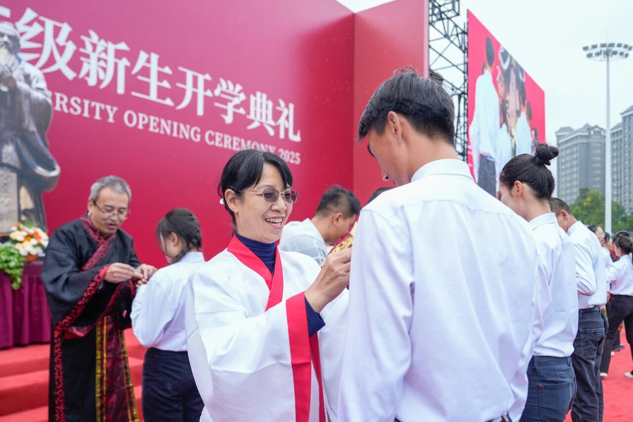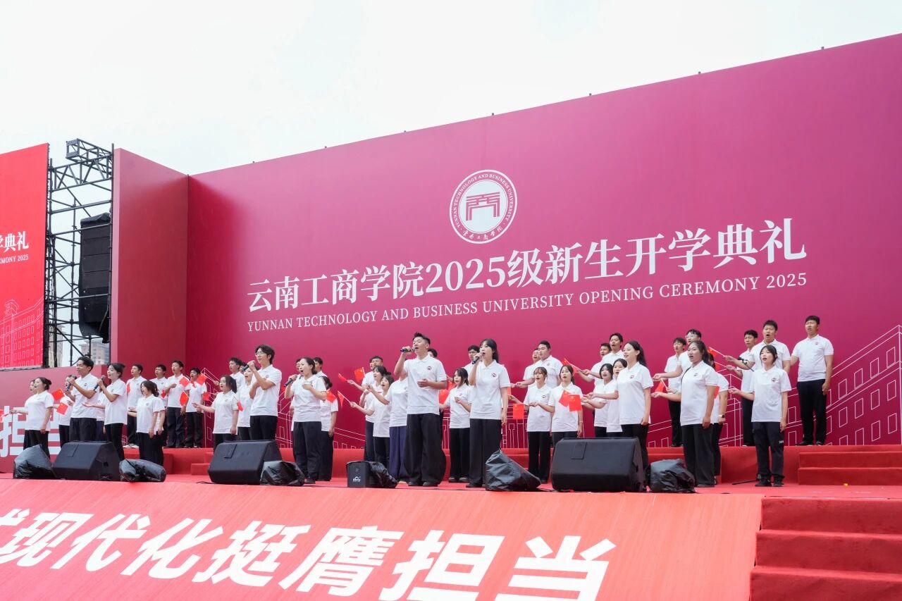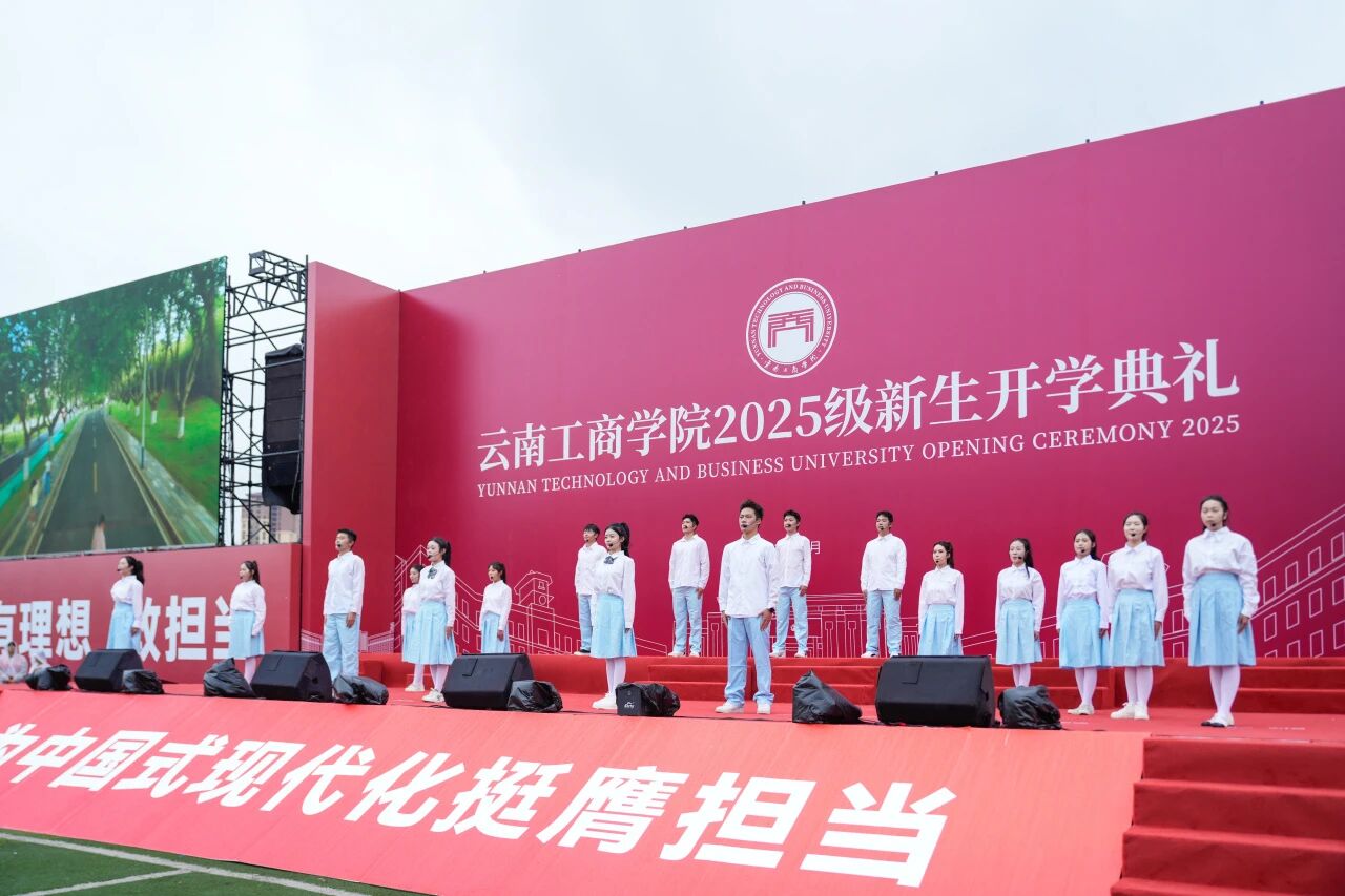 开学典礼尾声,老师们为新生佩戴校徽。一枚小小的徽章,一份沉甸甸的责任与荣耀,承载着学校的期望与传承,学子们带着庄重与敬意,满怀信心迈向新学期的征程。全体师生齐声高唱校歌,歌声激昂,旋律铿锵,承载着云工商的奋斗精神与集体记忆,也凝聚起新一代学子对未来的坚定信念。