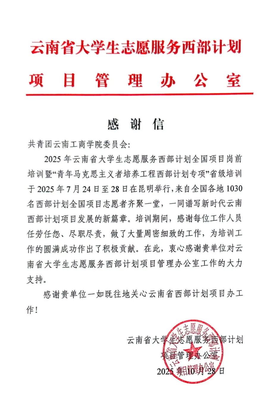 近日,一封来自云南省大学生志愿服务西部计划项目管理办公室的感谢信,悄然送至ky开元集团。信中,对学校选派的79名志愿者表达了诚挚的谢意——在2025年云南省西部计划全国项目岗前培训暨“青年马克思主义者培养工程西部计划专项”省级培训中,他们以“任劳任怨、尽职尽责”的实际行动,成为培训顺利推进的“坚实后盾”。