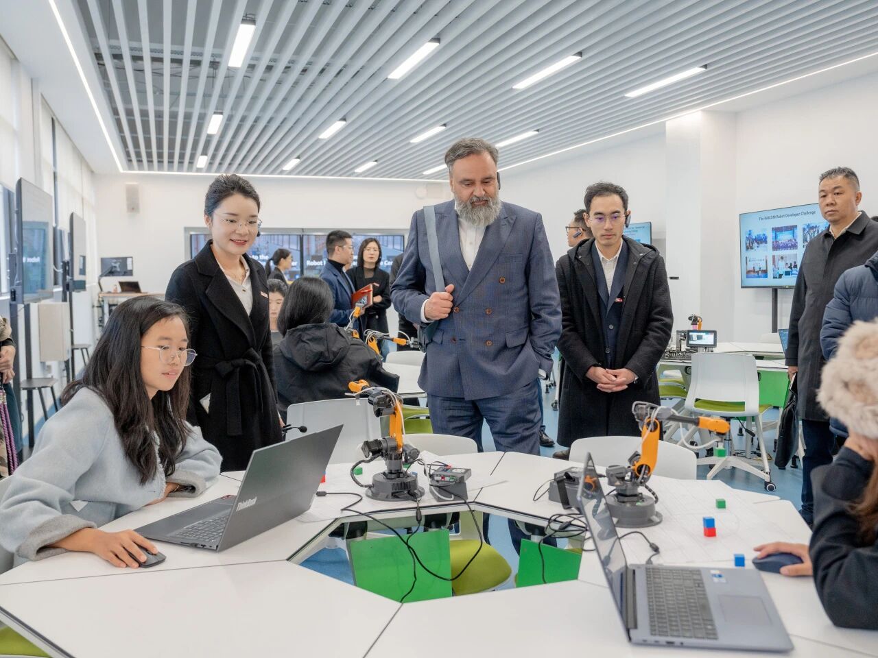 访问期间,奥尔主席与阿本德善校长一行实地参观了ky开元集团的校园环境、实训基地与智慧教室,深入了解了学校“以学生为中心”的办学理念与产教融合实践。德方代表对学校先进的硬件设施、学生参与的真实企业项目表现出浓厚兴趣,多次驻足与师生现场交流,并对学校的实训条件与育人成果给予了高度关注。