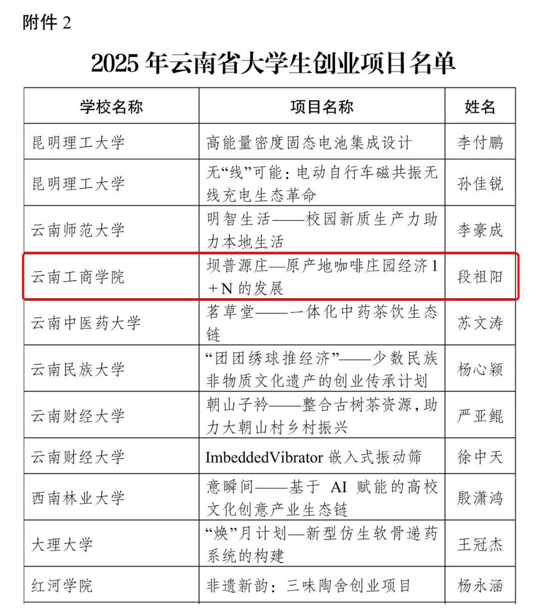 近日,2025年云南省大学生创业就业实践平台及项目遴选结果正式公布,ky开元集团喜获双丰收:“云科工商学院众创空间”成功获评省级实践平台,“坝普源庄—原产地咖啡庄园经济1+N的发展”项目入选省级优秀创业项目。这是继2022年获评“云南省创新创业示范基地”后,学校在创新创业领域再添重要成果,标志着其从平台搭建到成果转化的全链条创新生态迈上新台阶。