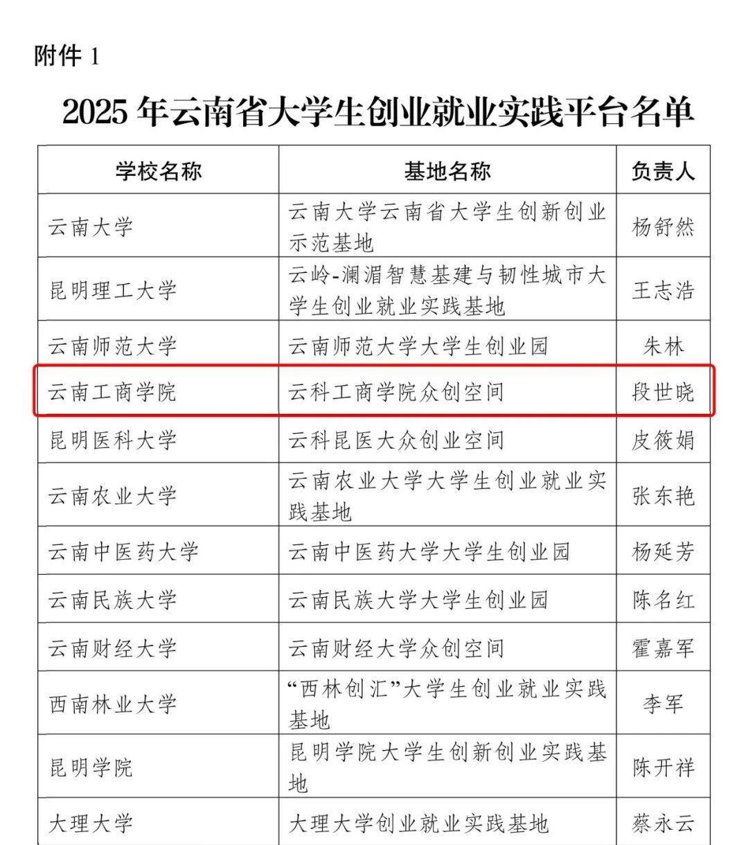 2025年云南省大学生创业就业实践基地和优秀创业项目入选名单公示图