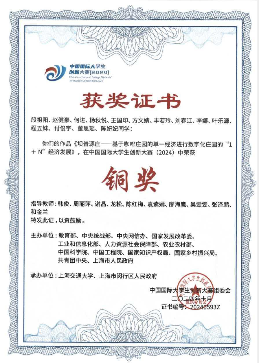 “坝普源庄—原产地咖啡庄园经济 1+N 的发展”项目获中国国际大学生创新大赛铜奖证书