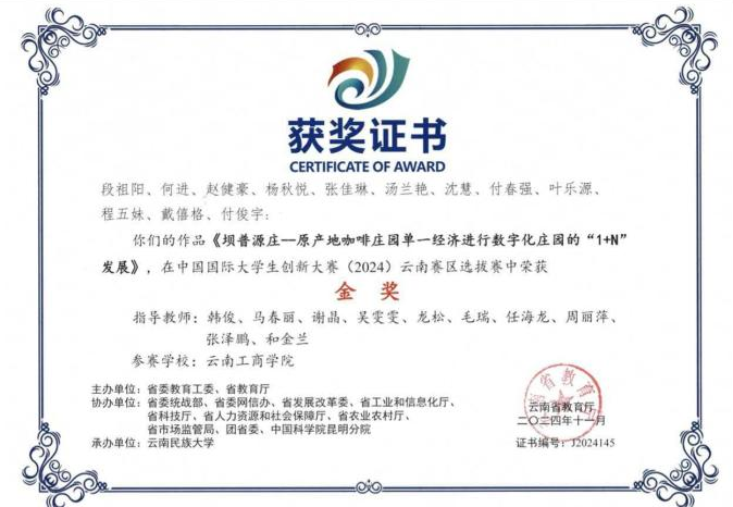 “坝普源庄—原产地咖啡庄园经济 1+N 的发展”项目获中国国际大学生创新大赛云南赛区金奖证书