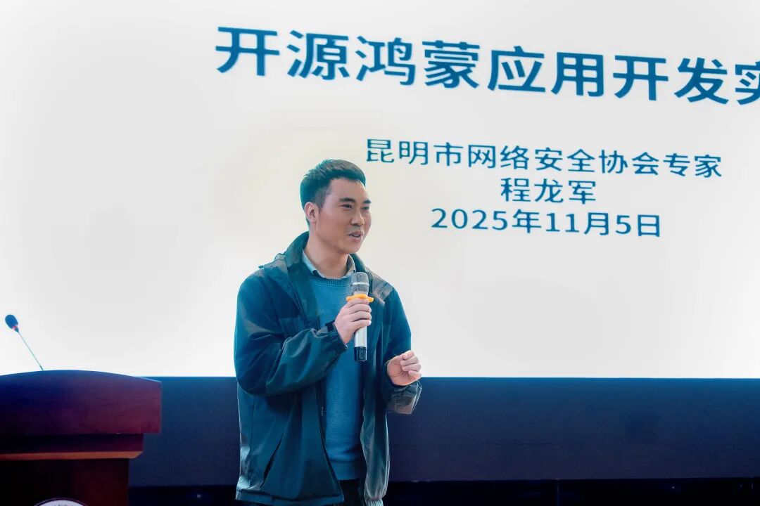 昆明市网络安全协会专家程龙军围绕《探索开源鸿蒙:操作系统新纪元》展开演讲,与师生共同探讨国产开源技术的发展机遇与人才需求。他系统梳理了开源鸿蒙从起步到生态成型的演进路径,深入解析其分布式架构与全场景适配的核心优势,并强调开源技术是培养创新人才的重要载体。程龙军希望以此次活动为契机,促进学校与行业资源深度融合,推动校企联合开发课程、共建实训基地,真正实现人才培养与产业需求的无缝衔接。