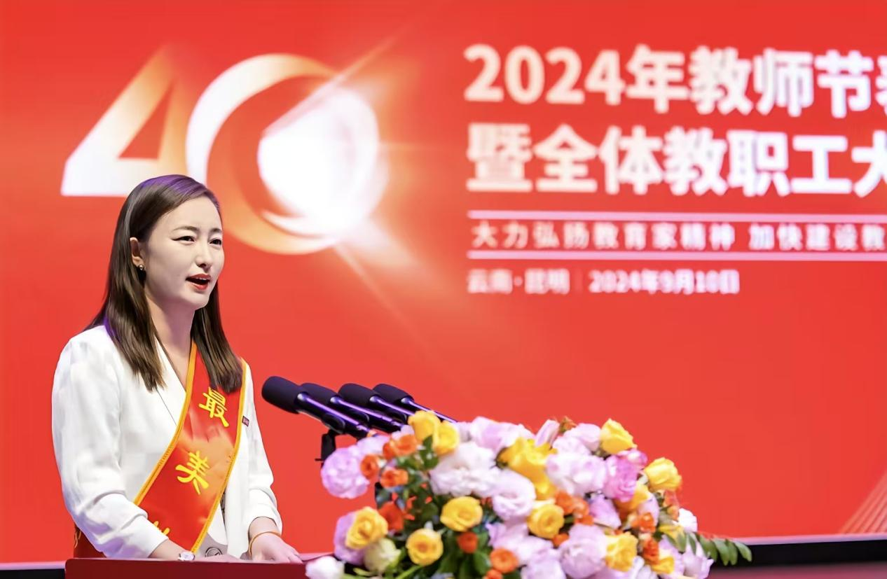 年度表彰大会上,张静老师作为最美教师和杰出贡献者代表发言