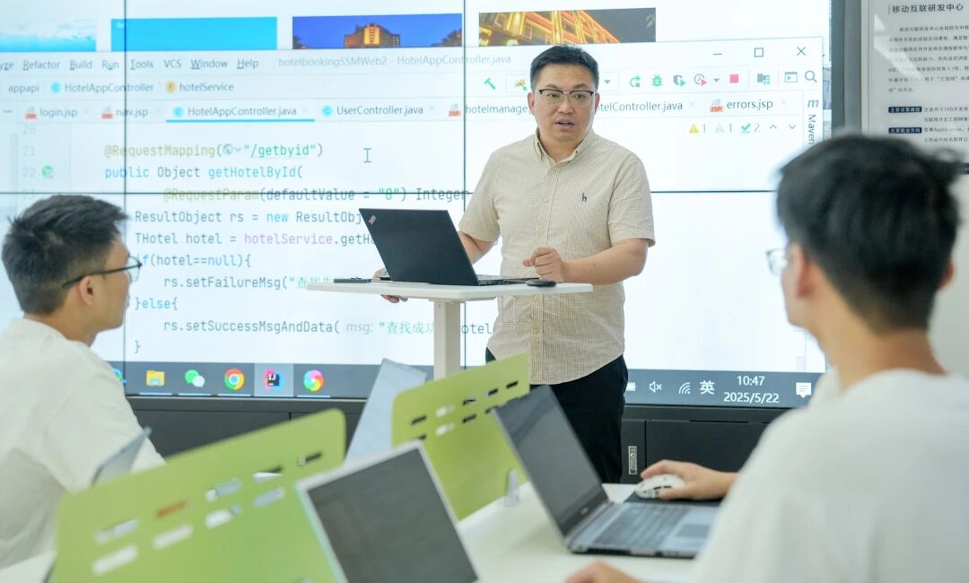 这一套人生哲学,被张锦盛老师深刻地融入严谨的代码教学之中。在他的网页开发实训课上,每一次现场演示和代码调试,都不只是技术传递,更是思维与心性的锤炼。当学生面对报错陷入困顿时,他会引用“超越自己”的智慧,引导学生将“BUG”视为重组逻辑路径、突破思维惯性的契机;当学生完成一个项目时,他会启发他们思考如何“创造自己”的价值......他始终围绕“解决问题、创造价值”这一核心开展教学,致力于帮助学生成长为不仅技术娴熟,更具备内在驱动、人文视野与社会责任感的技术创造者。