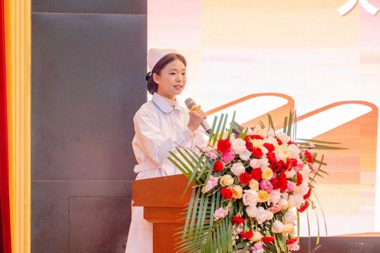 聆听楷模箴言后,2025 级护理专业学生代表刘曦上台发言,承诺将传承南丁格尔精神,以仁爱之心与专业之力,肩负生命重托,不负前辈期许与学校培养。