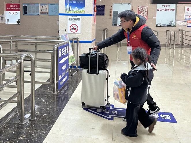 身着志愿者服,骆涛的身影遍布高铁站的各个服务点位——在安检处,他主动接过务工人员手中的大件行李,协助过机检查、整理随身物品;在进站通道,他手持引导牌,耐心指引大家有序进站,细致讲解检票流程和车厢位置,反复叮嘱出行安全;在候车区,他主动答疑解惑、协助整理出行物资,用热情的笑容和贴心的话语,让务工人员感受到家乡的温暖。