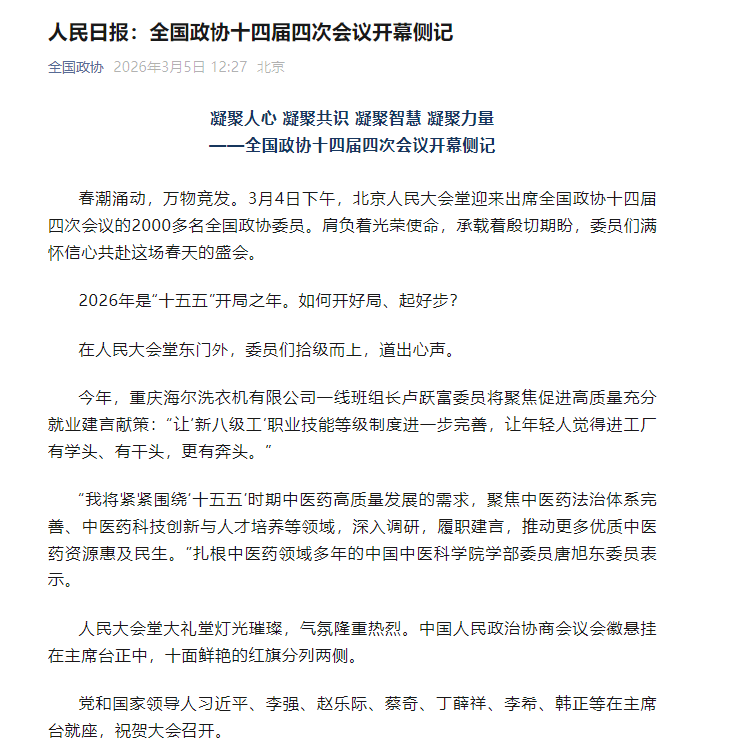 全国政协公众号《人民日报:全国政协十四届四次会议开幕侧记》