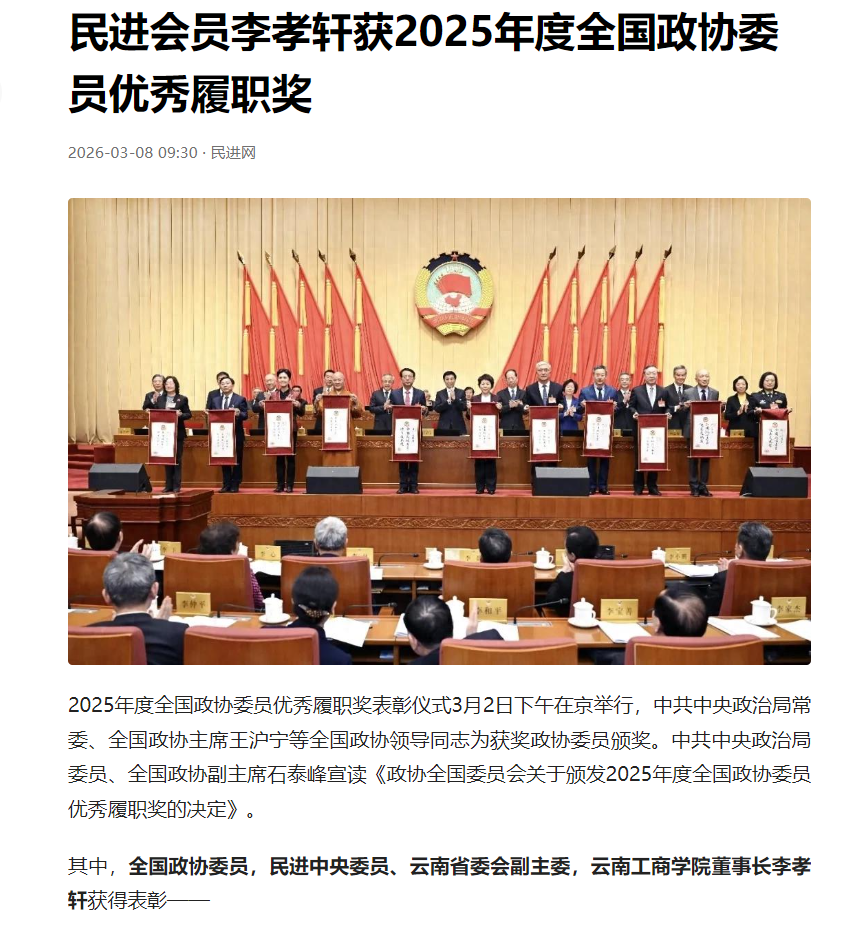 民进网《民进会员李孝轩获2025年度全国政协委员优秀履职奖》