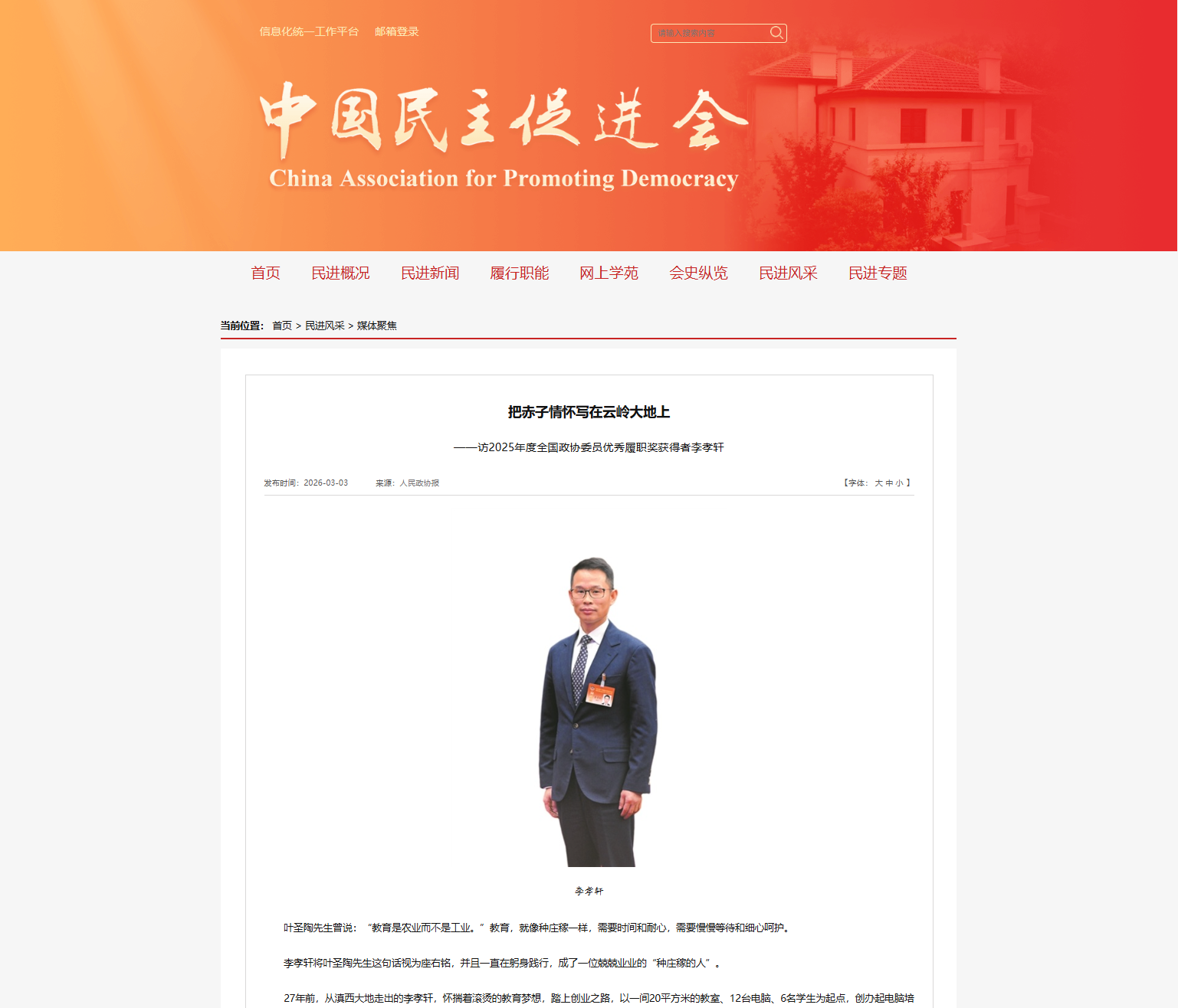 民进网《把赤子情怀写在云岭大地上——访2025年度全国政协委员优秀履职奖获得者李孝轩》