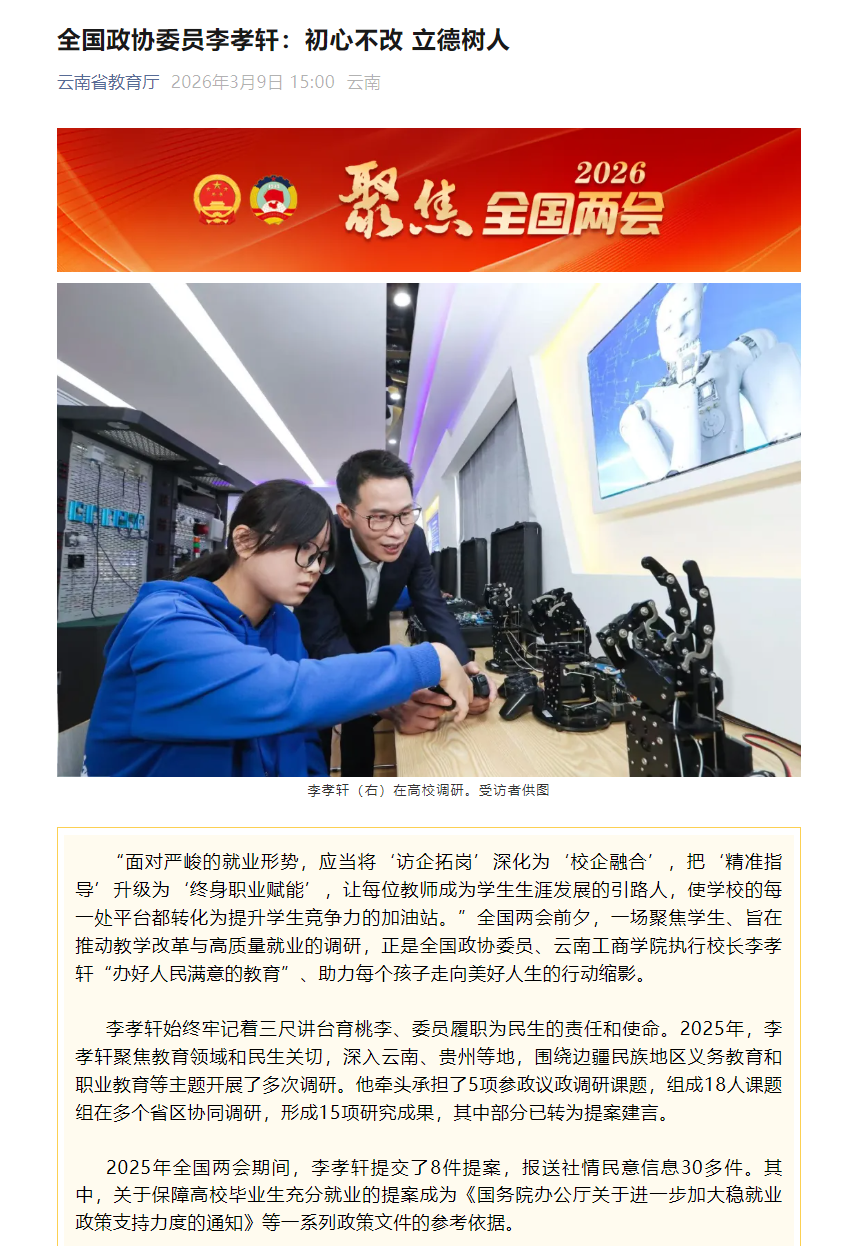 云南网《【聚焦2026全国两会】全国政协委员李孝轩——初心不改 立德树人》
