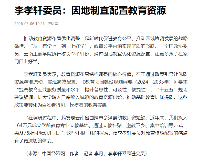 民进网《李孝轩委员:因地制宜配置教育资源》