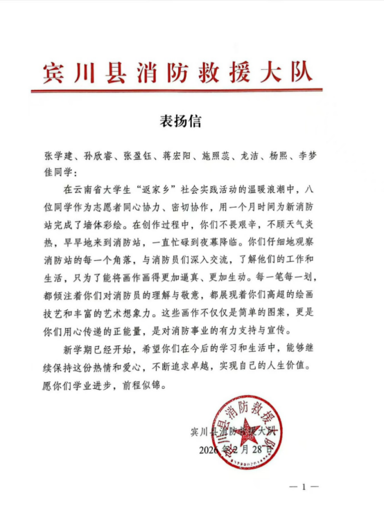从清晨忙到夜幕,日复一日的坚持,让一幅幅彩绘慢慢成型,这份认真执着的志愿态度,也收获了宾川县消防救援大队的表扬信!