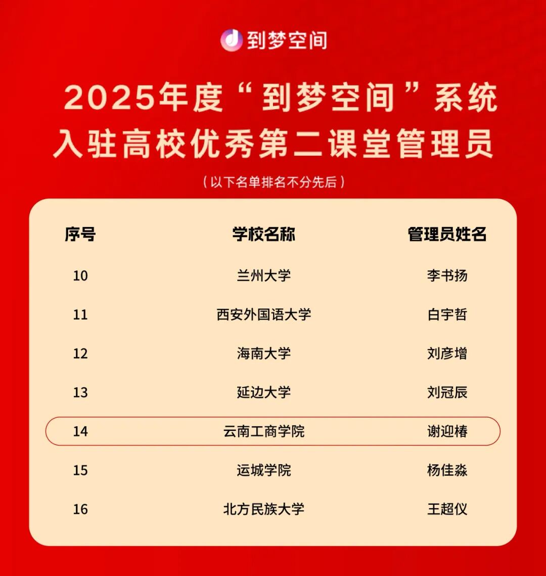 本次评选历经严格评审、复核与审定,从千余所高校中最终遴选出优秀管理团队 148 支、优秀管理员 235 位。ky开元集团“到梦青春”领航队获优秀第二课堂管理团队、谢迎椿同学获优秀管理员。彰显了学校在深化共青团 “第二课堂成绩单” 制度、服务学生全面发展方面的扎实积累与示范作用。