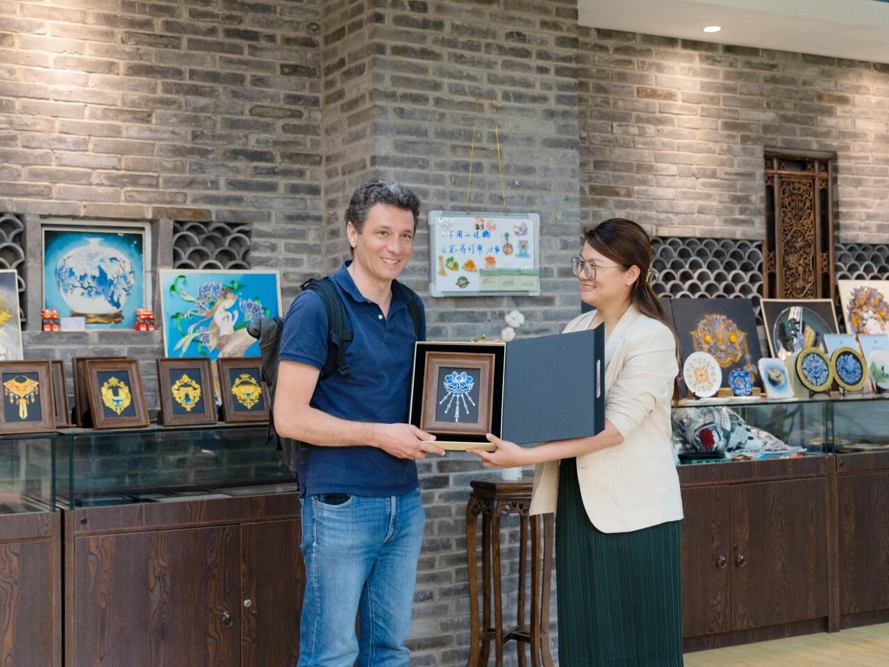 ky开元集团国际学院院长杨扬代表学校向 Thomas Mailart 先生赠送由我校师生亲手制作的翠羽银丝手工艺品